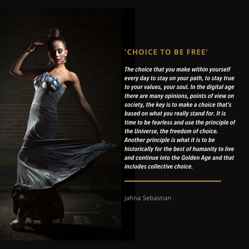 ‘The choice that you make within yourself every day to stay on your path, to stay true to your values, your soul. In the digital age there are many opinions, points of view on society, the key is to make a choice that’s based on what you really stand for. It is time to be fearless and use the principle of the Universe, the freedom of choice. Another principle is what it is to be historically for the best of humanity to live and continue into the Golden Age and that includes collective choice.’ Jahna Sebastian